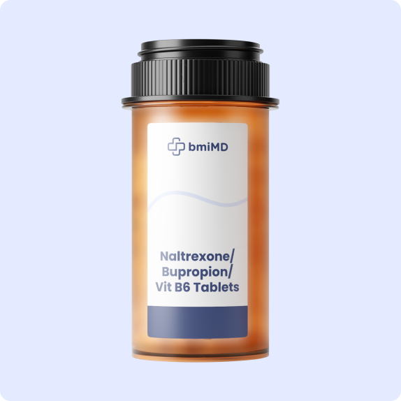 Our compounded Naltrexone/Bupropion/Vitamin B6 formula is tailored to help manage weight effectively by targeting both appetite and cravings. This unique formulation combines two medications plus Vitamin B6—Bupropion, which helps reduce hunger, and Naltrexone, which curbs cravings—allowing for a more personalized approach to weight management under the guidance of your bmiMD provider.